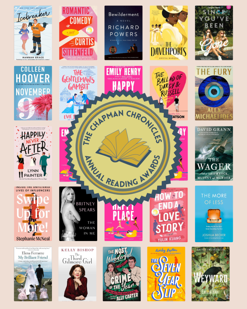 It’s awards season, baybee! But instead of rolling out the red carpet, I’m rolling out the book cart to honor some of the books I read last year. I even created my very own The Chapman Chronicles Annual Reading Awards seal to make it look official.